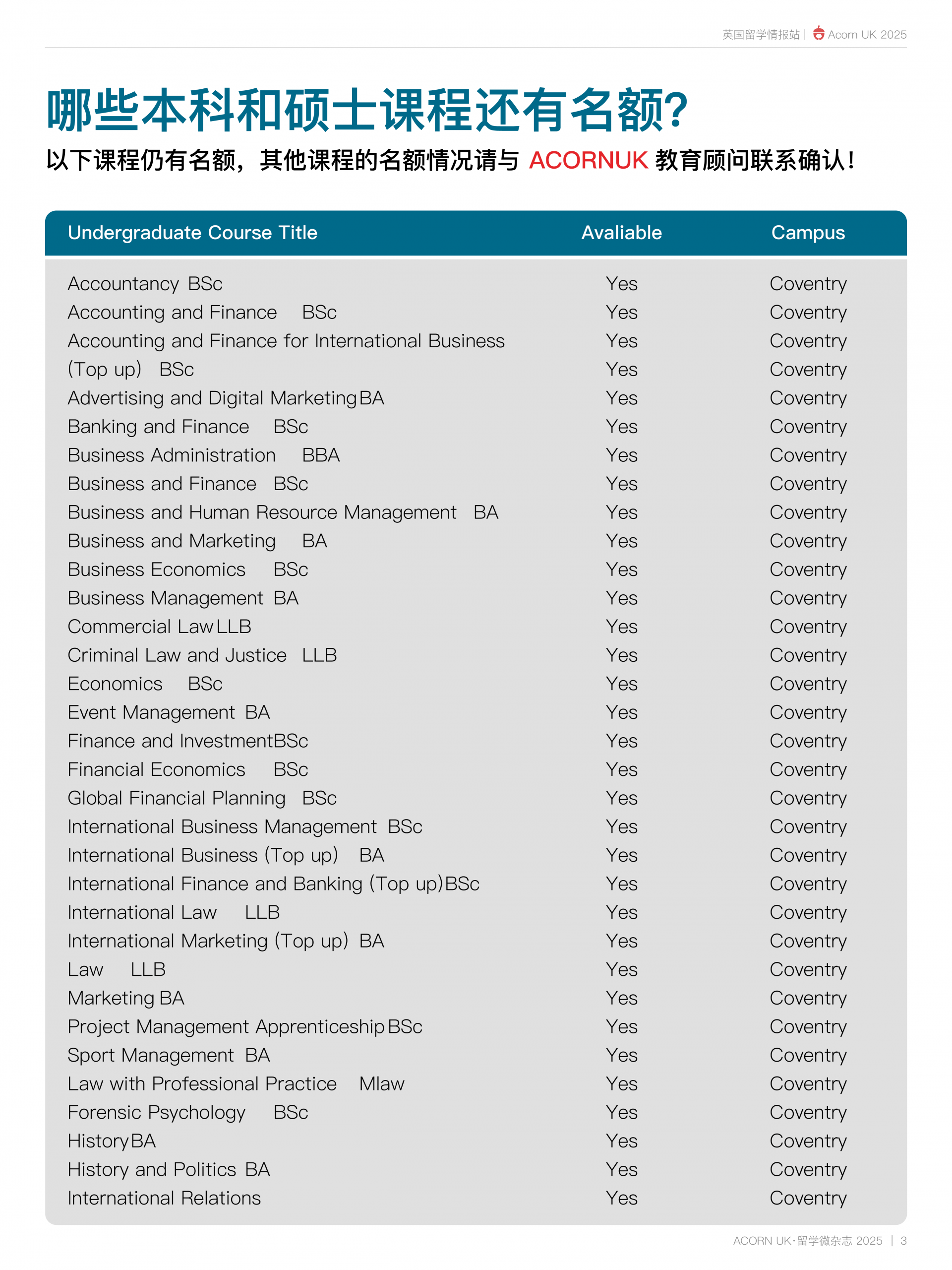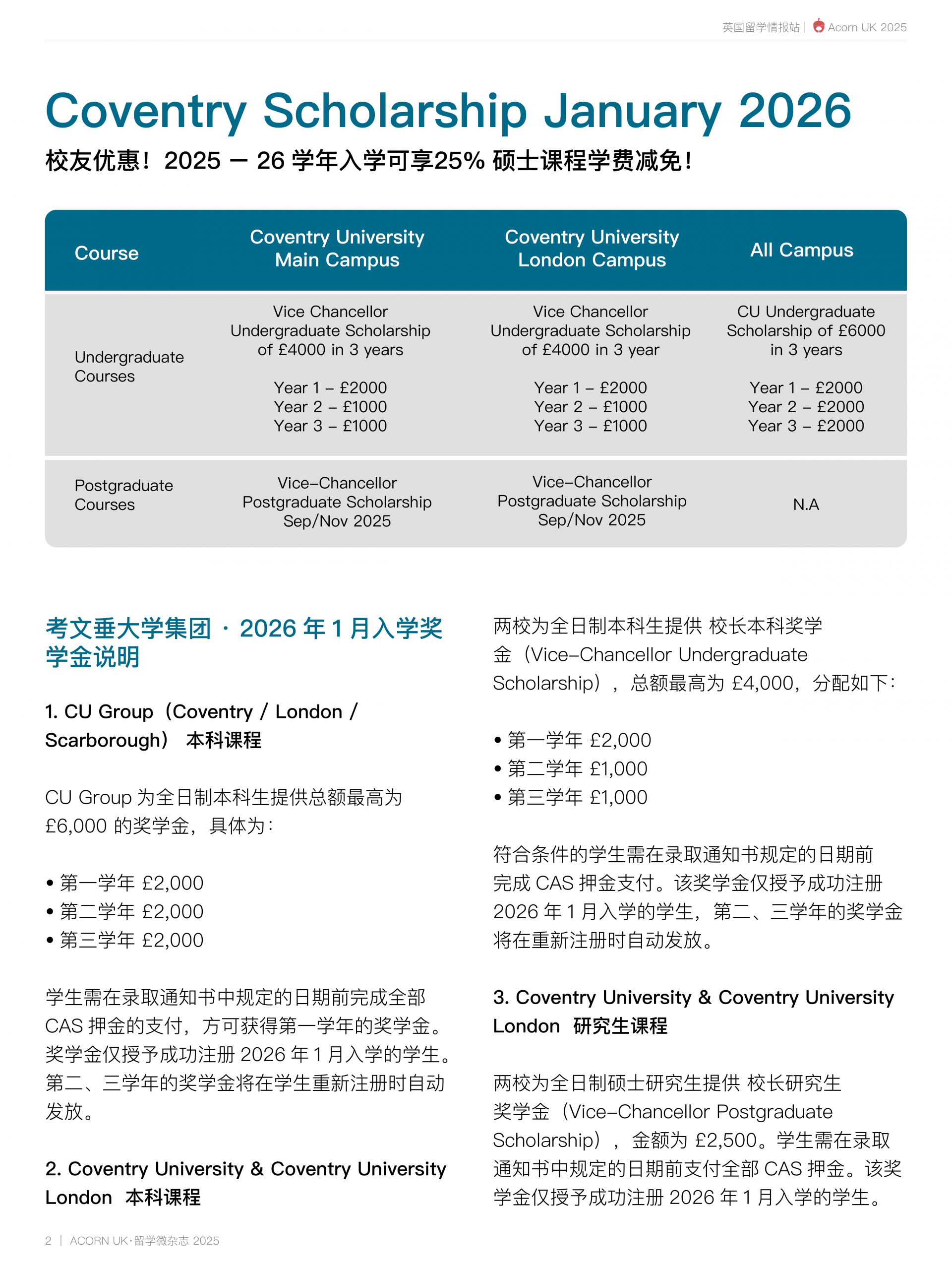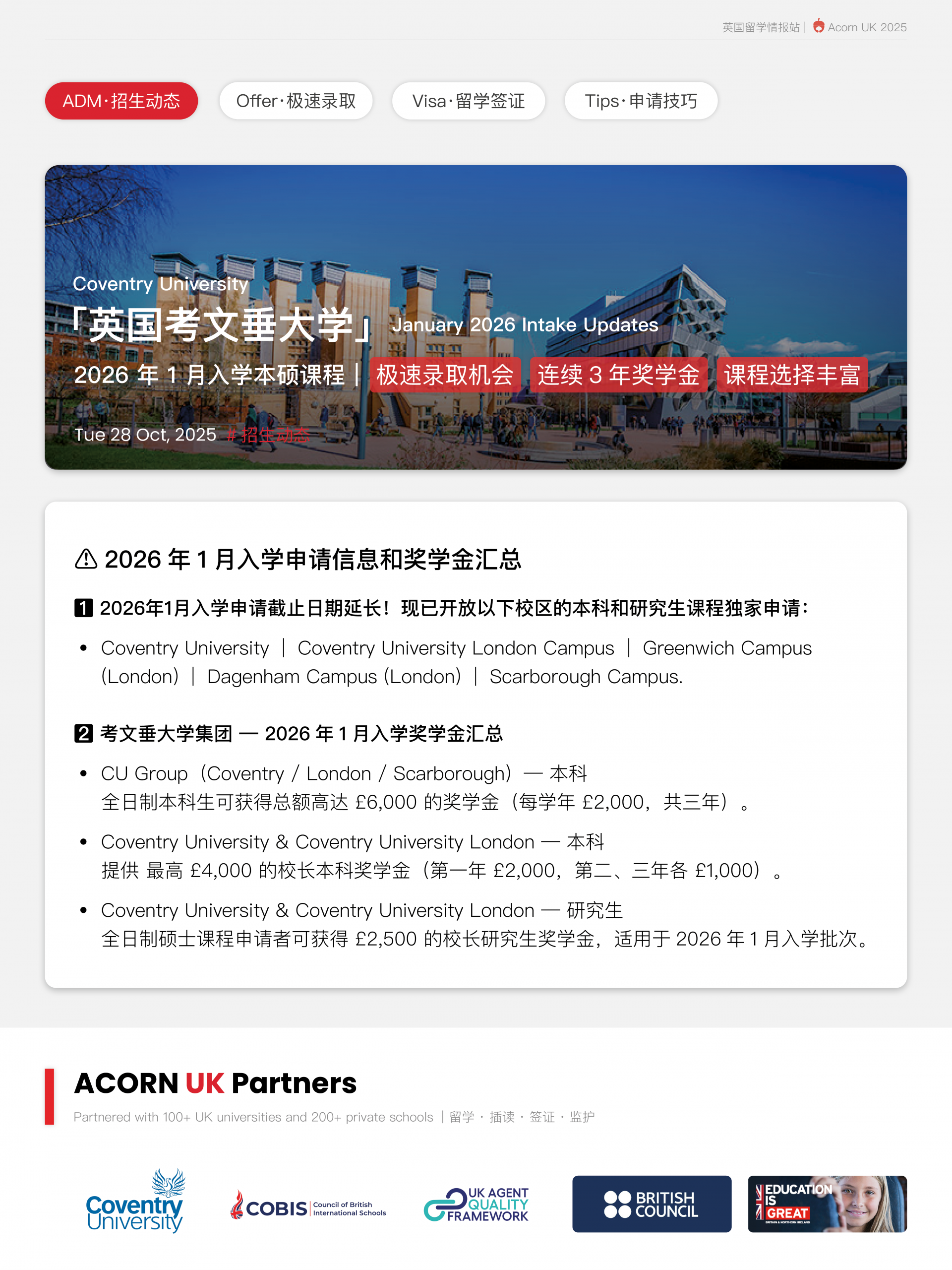 ⊙  考文垂大学 Coventry University 2026年1月入学仍在开放申请!商科、法律、工程、计算机等多领域课程可选,奖学金最高£6,000!涵盖 考文垂主校区、伦敦校区、格林威治校区、斯卡伯勒校区 等多个校区,本科与硕士课程均有名额,部分课程截止日期延长,抓紧机会!